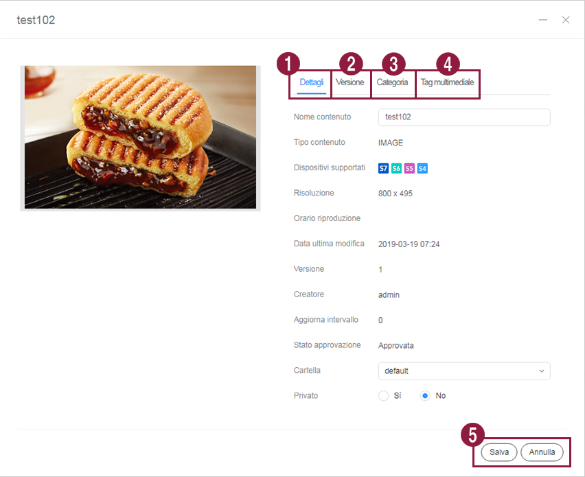 1 Consente di visualizzare le informazioni dettagliate di un file di contenuto. È possibile modificare il nome di un contenuto o il gruppo. È inoltre disponibile un'opzione di condivisione.