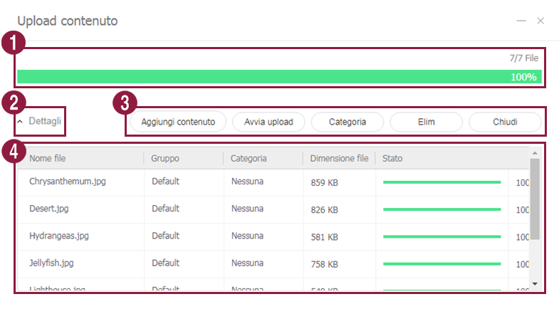 4 Consente di visualizzare le informazioni dettagliate del file o dei file di contenuto da caricare.