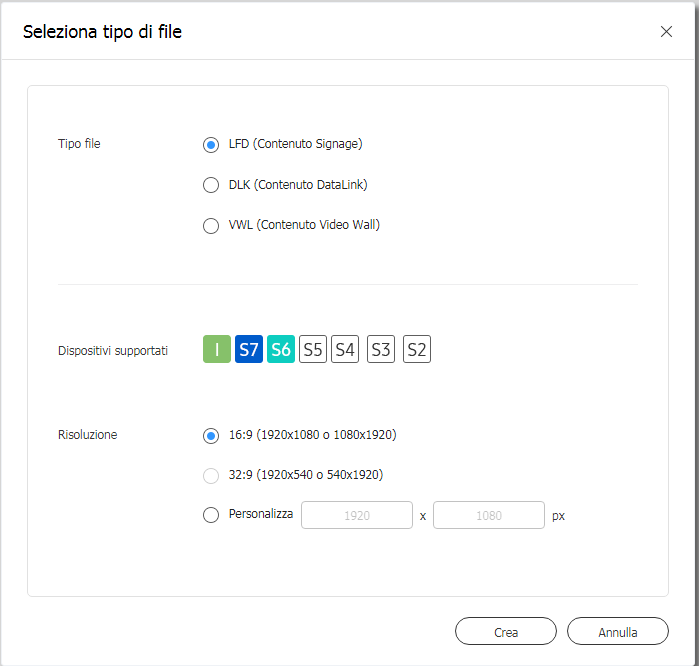 Selezionare LFD (Contenuto Signage), indicare i dispositivi supportati e la risoluzione, infine Cliccare su Crea.