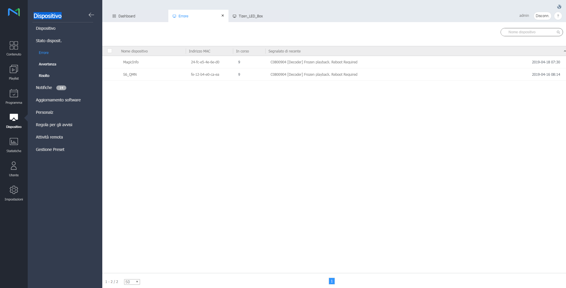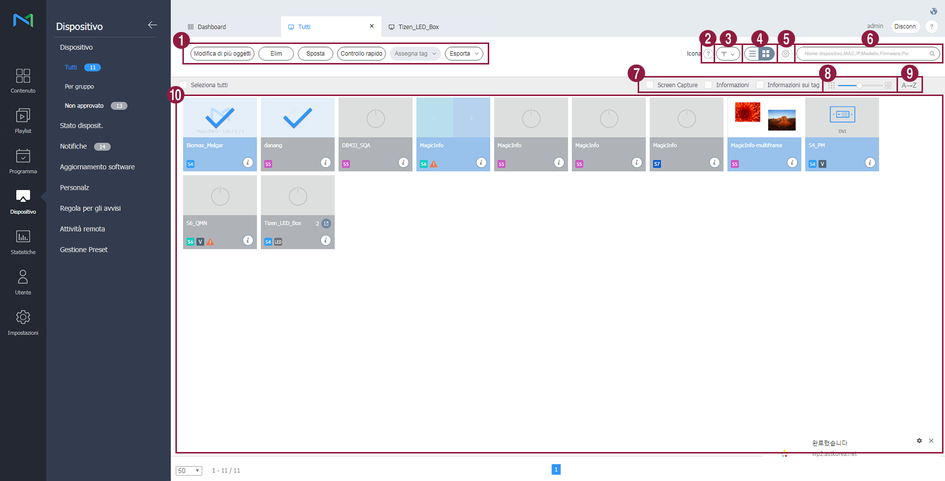 2 Consente di visualizzare la barra dei menu principale di MagicINFO Server. Cliccare su una voce di menu per visualizzarne la pagina delle funzionalità.