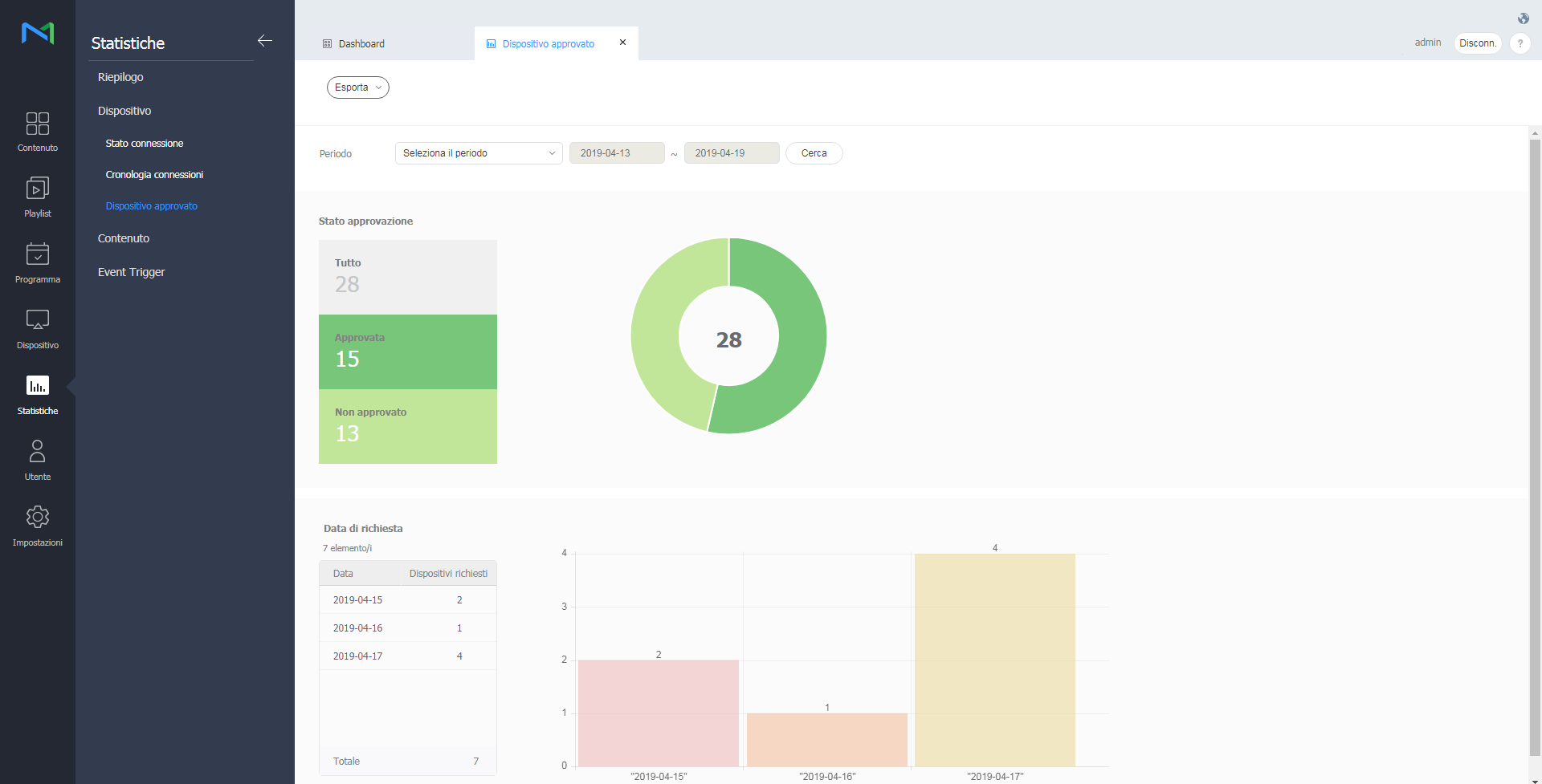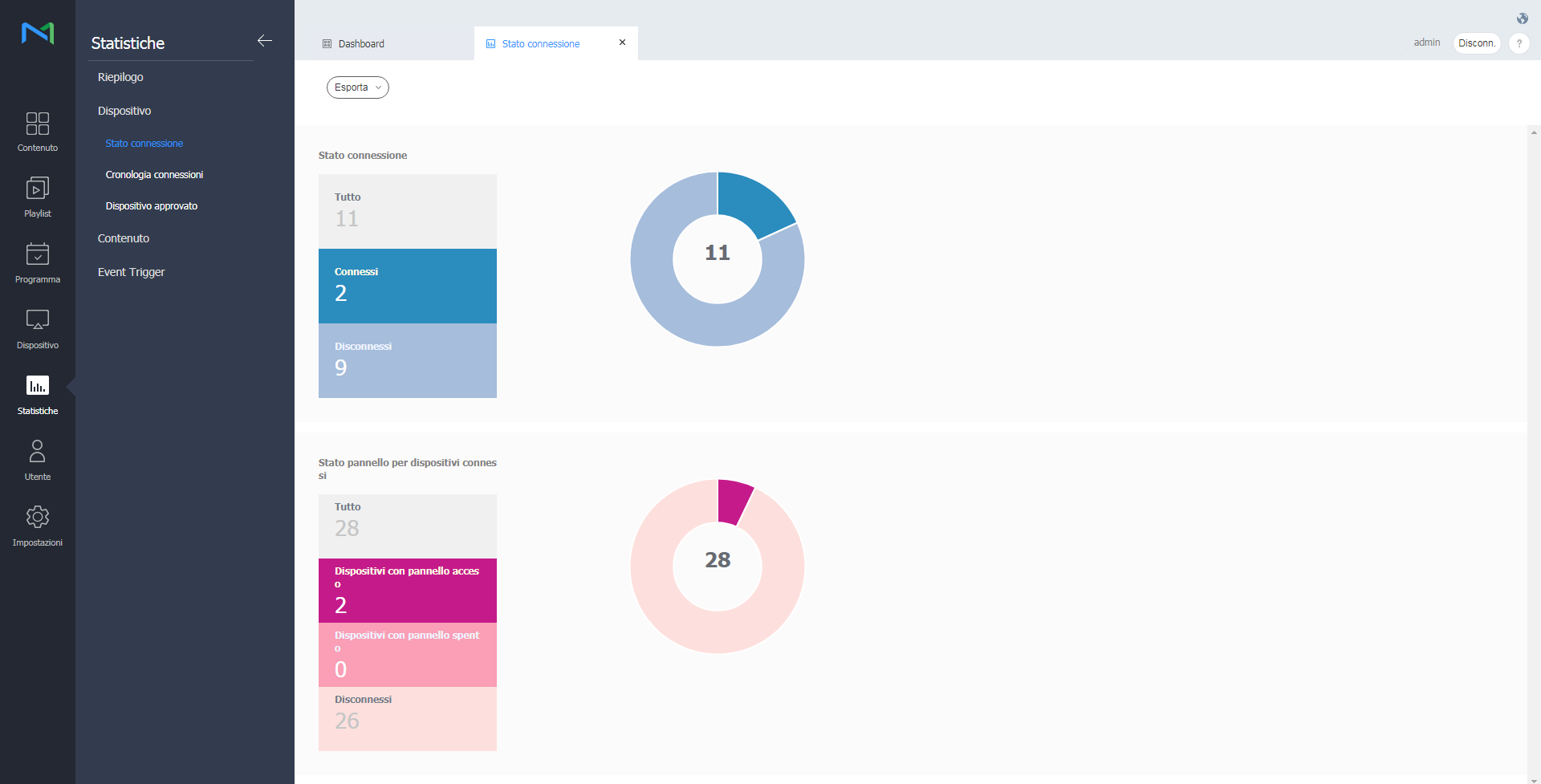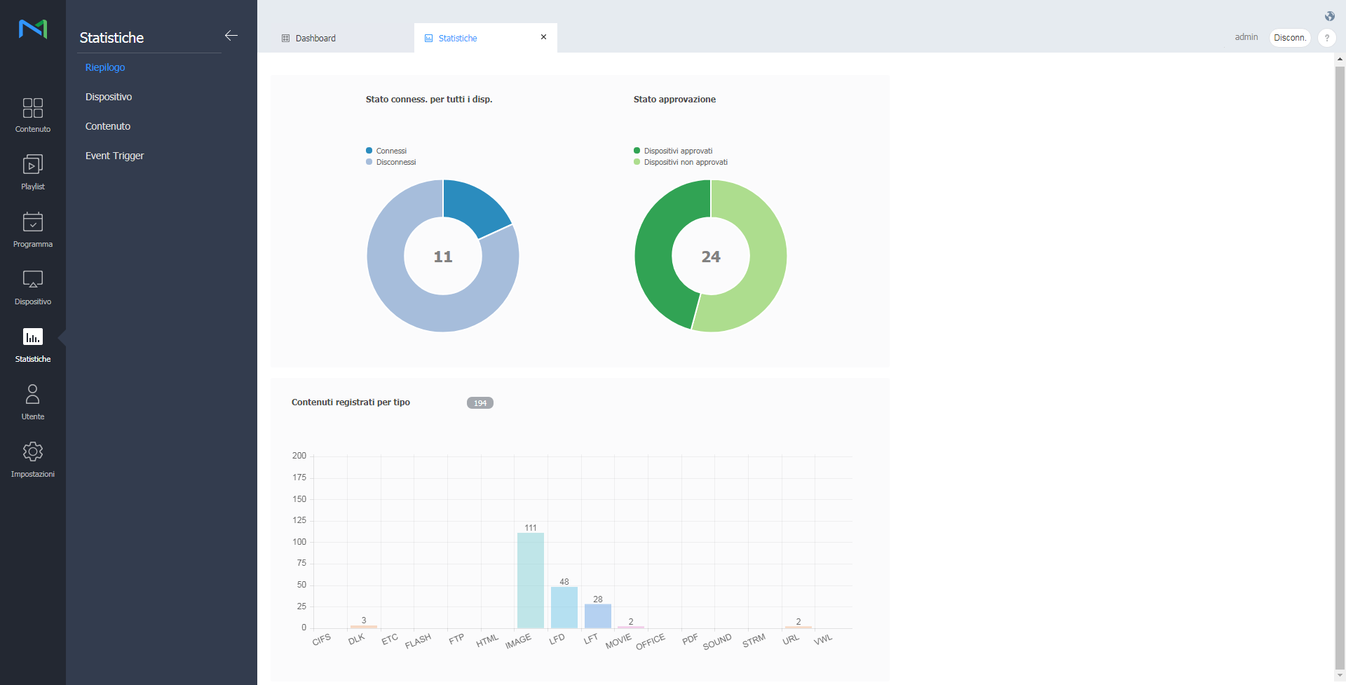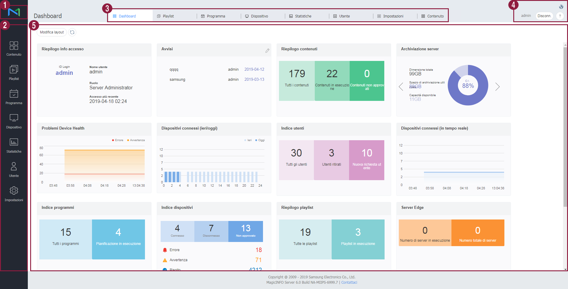 5 La scheda Dashboard consente una visualizzazione personalizzata delle informazioni gestite da MagicINFO Server, come avvisi e indici di file di contenuti. Il layout della scheda Dashboard può essere definito dall'utente.