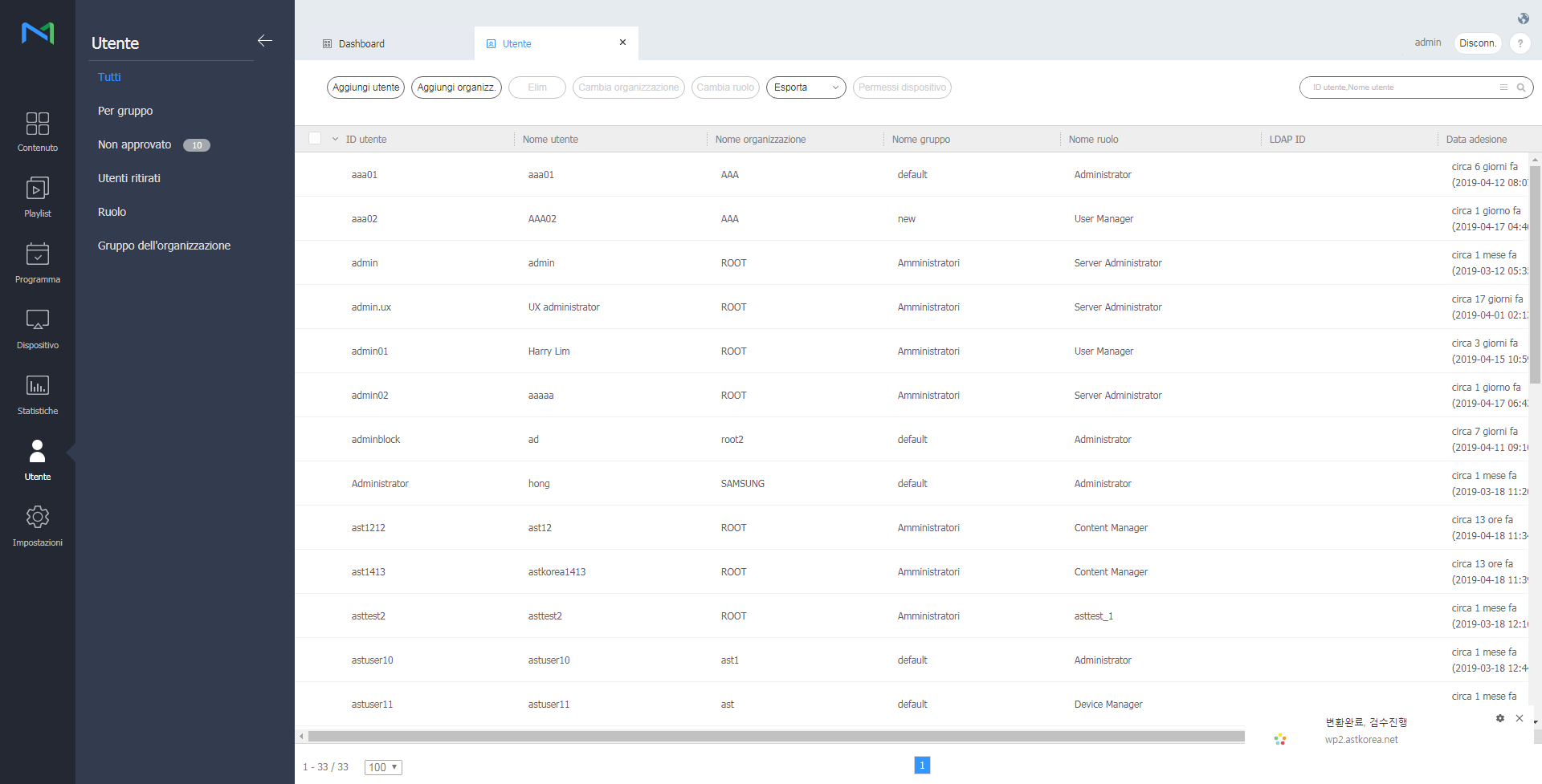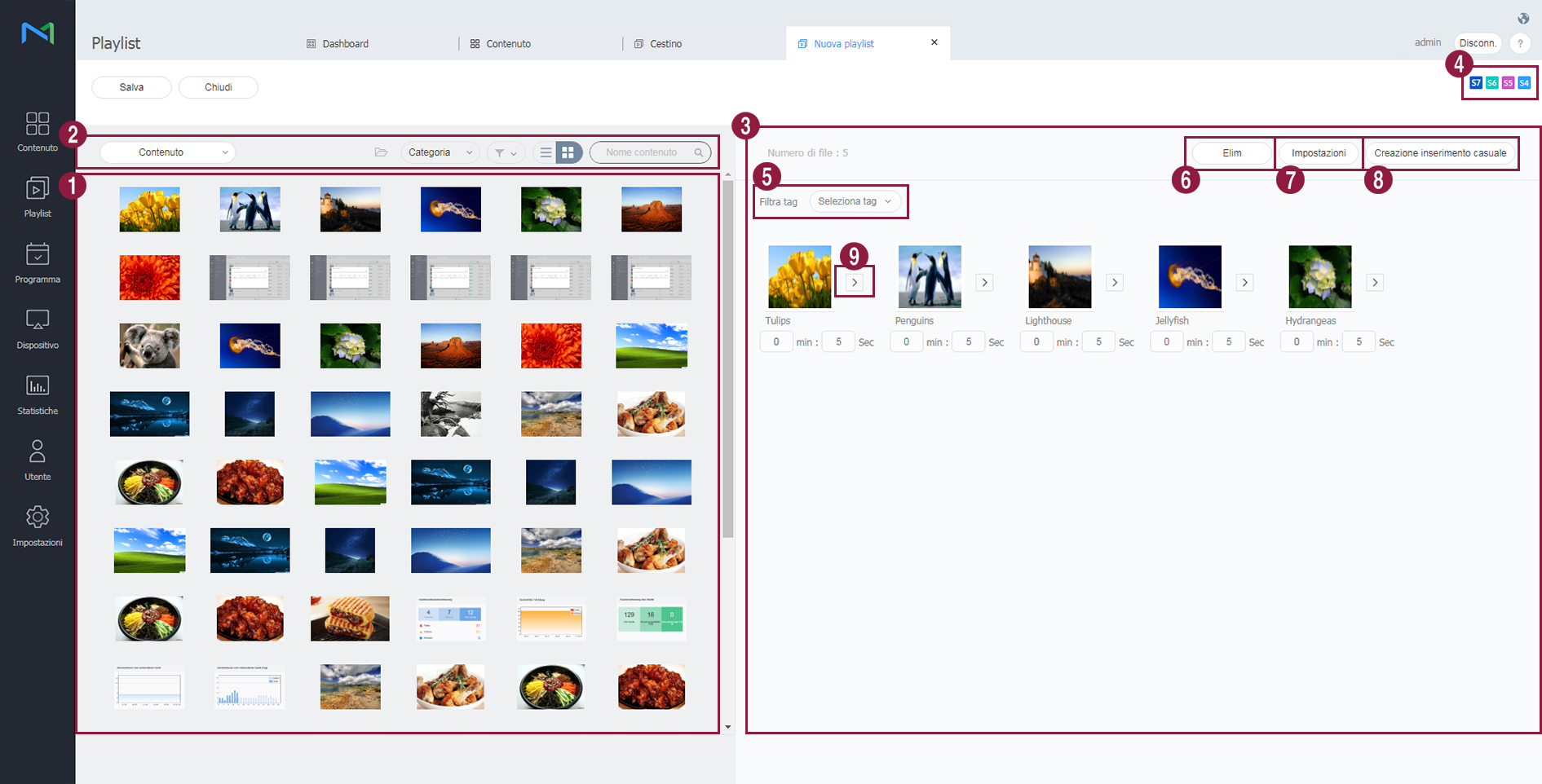 4 Consente di visualizzare l'ID utente che ha effettuato l'accesso. Cliccare su un ID utente per aprire la pagina di gestione delle informazioni utente. Per eseguire il logout da MagicINFO Server, cliccare su Disconn. Per visualizzare il video della guida, cliccare sull'icona del punto interrogativo . Per modificare la lingua dell'interfaccia utente, cliccare sull'icona a forma di pianeta Terra .