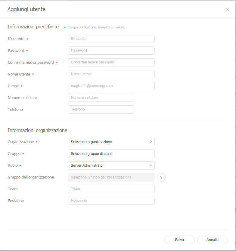 1 Immettere http://(IP MagicINFO Server ):7001/MagicINFO nella barra degli indirizzi del browser web.