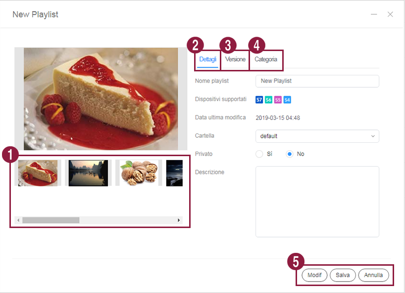 1 Consente di visualizzare le informazioni dettagliate di un file di contenuto. È possibile modificare il nome di un contenuto o il gruppo. È inoltre disponibile un'opzione di condivisione.