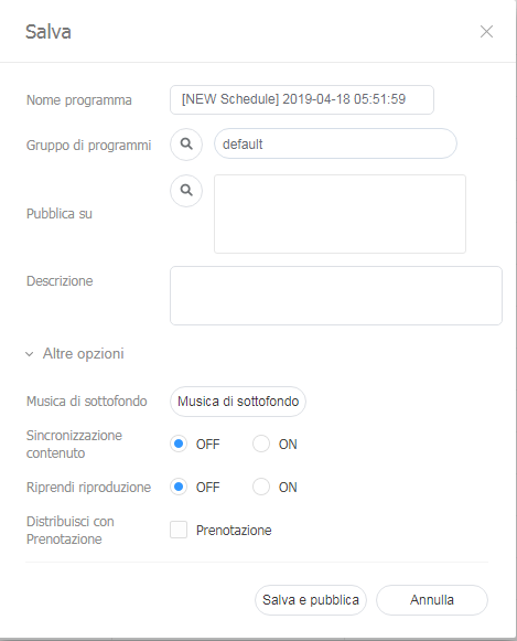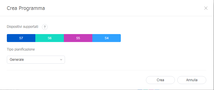 Selezionare LFD (Contenuto Signage), indicare i dispositivi supportati e la risoluzione, infine Cliccare su Crea.