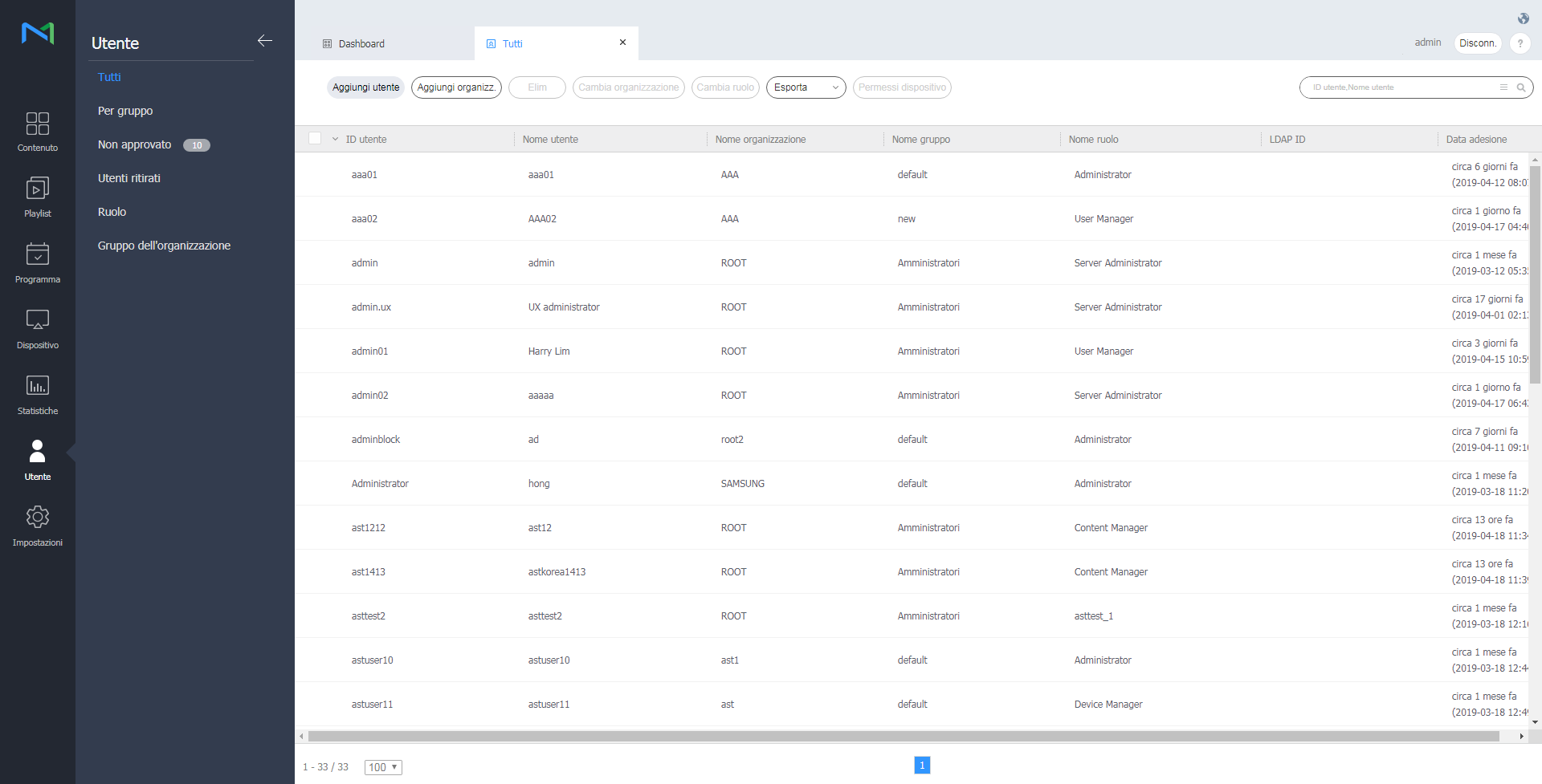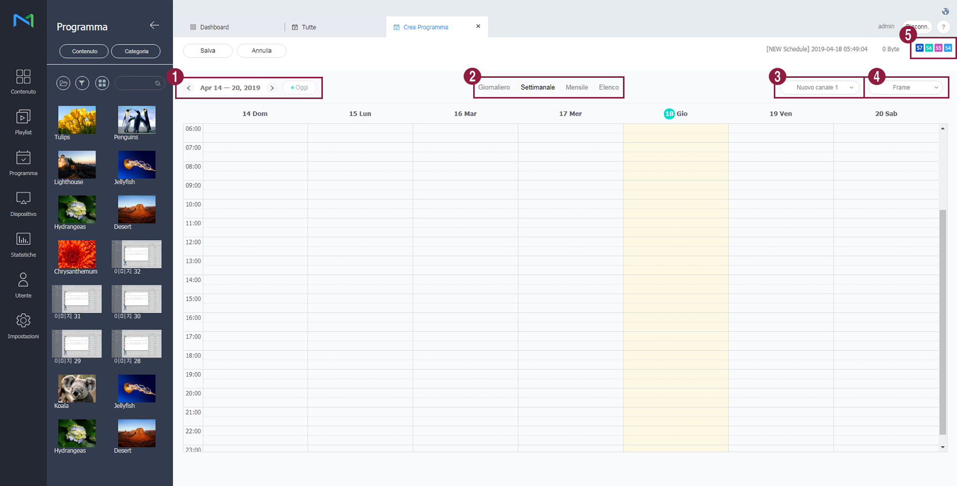 4 Consente di visualizzare l'ID utente che ha effettuato l'accesso. Cliccare su un ID utente per aprire la pagina di gestione delle informazioni utente. Per eseguire il logout da MagicINFO Server, cliccare su Disconn. Per visualizzare il video della guida, cliccare sull'icona del punto interrogativo . Per modificare la lingua dell'interfaccia utente, cliccare sull'icona a forma di pianeta Terra .