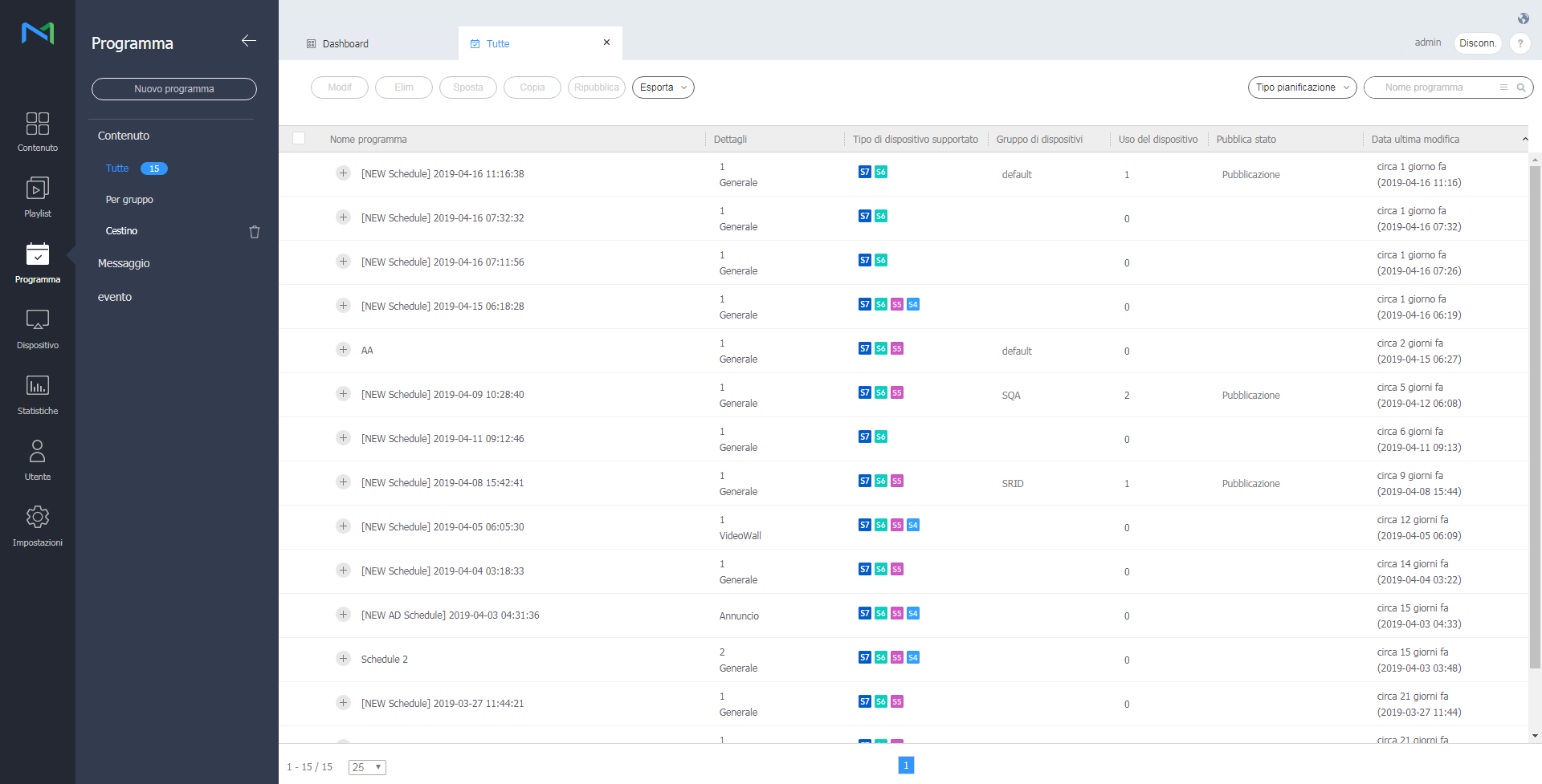 5 La scheda Dashboard consente una visualizzazione personalizzata delle informazioni gestite da MagicINFO Server, come avvisi e indici di file di contenuti. Il layout della scheda Dashboard può essere definito dall'utente.